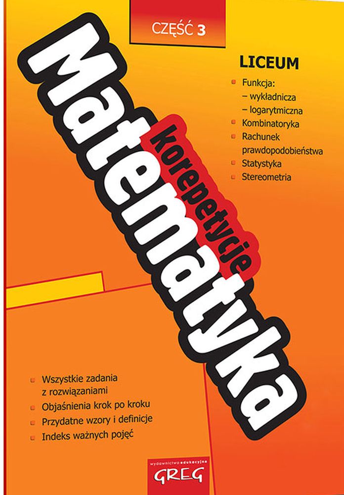 Seria Matematyka - korepetycje zawiera 3 części, w których omówione zostały poszczególne zagadnienia z programu zreformowanego liceum. Książki zawierają zarówno wiedzę teoretyczną: reguły, prawa, wzory, twierdzenia, definicje, jak i liczne zadania. Autorzy serii zamieścili w swoich częściach zarówno zadania proste, standardowe, jak i te, z którymi uczniowie najczęściej mają kłopoty. Wyjątkowość tej serii polega na tym, iż każde zadanie posiada pełne rozwiązanie wraz z pełnym opisem każdego działania. Z tymi książkami poczujesz się pewnie na każdej lekcji matematyki!