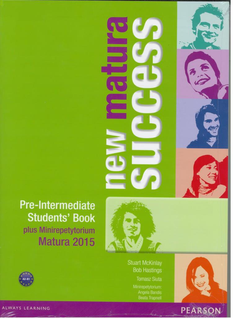 New Matura Successto najnowsza edycjabestsellerowego kursudla szkół ponadgimnazjalnych. Nowe, inspirująceteksty, zdjęcia oraz filmyzostały dobrane w taki sposób, aby każdy licealista mógł identyfikować się z poruszanymi w podręczniku zagadnieniami i skutecznie przygotować się do matury.O kursieNew Matura Successto najnowsza edycjabestsellerowego kursudla szkół ponadgimnazjalnych. Nowe, inspirująceteksty, zdjęcia oraz filmyzostały dobrane w taki sposób, aby każdy licealista mógł identyfikować się z poruszanymi w podręczniku zagadnieniami i skutecznie przygotować się do matury. Rzetelne przygotowanie do matury Regularne powtórkipomagają uczniom śledzić postępy w nauce i zawierają kolejne zadania maturalne oswajające ich z formatem egzaminu. Strategie maturalneorazBank funkcji językowychpraktycznie wspierają przyszłych maturzystów. Ogromna ilość nagrań i ćwiczeńna rozumienie ze słuchu orazlekcjeWritingz zadaniami w formacie egzaminacyjnym krok po kroku przygotowują do matury. Wszystkieniezbędne na egzaminie słowasą zebrane w leksykalnych zestawieniach i utrwalane w zeszycie ćwiczeń. W związku z planowanymi zmianami w egzaminie maturalnym od 2015 roku, do podręczników New Matura Success Pre-Intermediate, Intermediate oraz Upper-Intermediate dołączonesąminirepetytoria z zadaniami dostosowanymi do egzaminu w zmienionej formule.