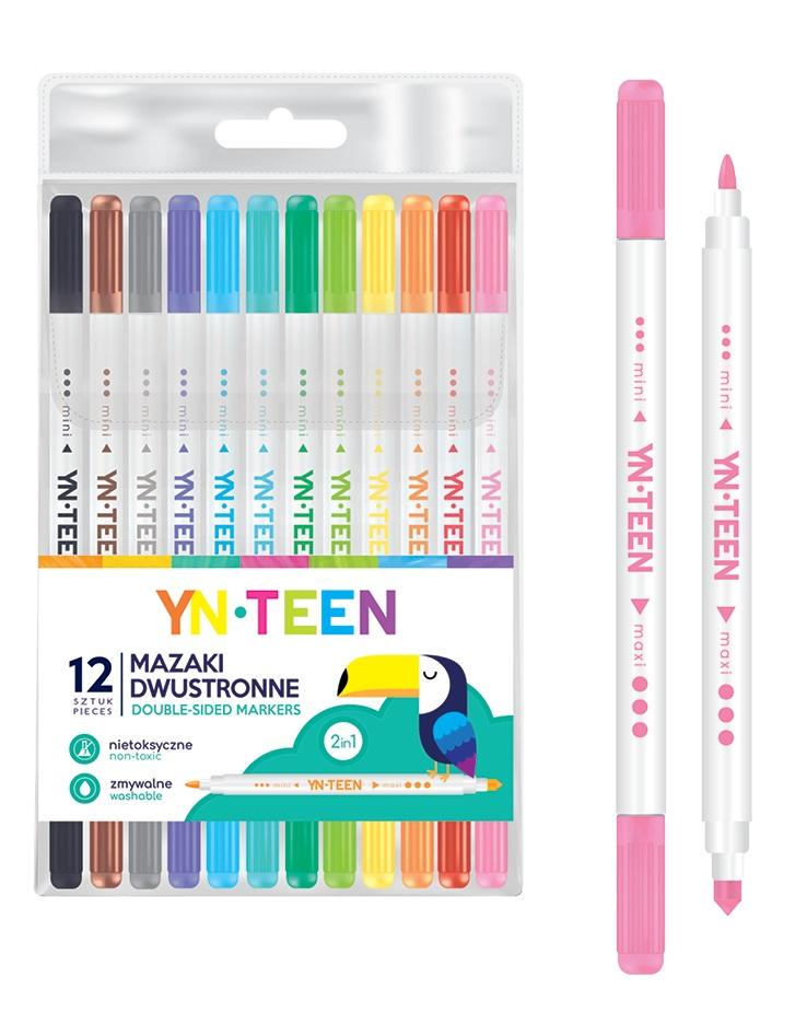 Opis produktuZasady bezpieczeństwaMazaki dwustronne o dwóch grubościach końcówek w 12 kolorach. Nietoksyczne i zmywalne. Okrągły profil. Mają wentylowaną skuwkę. x