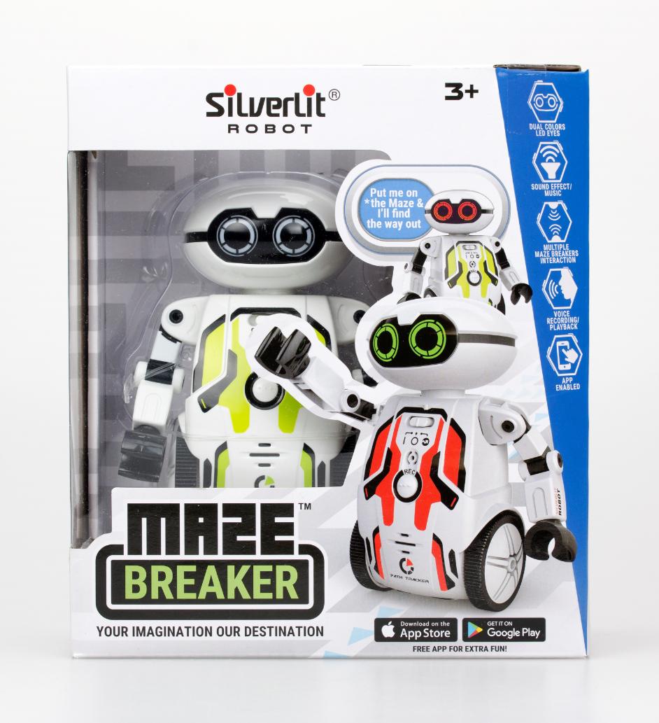 Opis produktuZasady bezpieczeństwaMaze Breaker to innowacyjny robot, który odnajduje drogę w labiryncie! Potrafi podążać za narysowaną czarną linią, pozostać wewnątrz zamkniętej pętli, a nawet tańczyć. Mów do niego, a Maze Breaker powtórzy Twoją wypowiedź głosem robota! Przekonaj się w jak różny sposób reaguje na sygnały dźwiękowe. Zabawka łączy się z innymi robotami Silverlit, a sterować możesz nią za pomocą telefonu. W skład zestawu wchodzi robot i plansza z labiryntem/ścieżką. Charakterystyka: