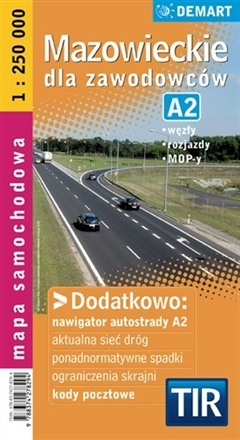 Mapa przeznaczona jest nie tylko dla kierowców zawodowych (TIR-ów, ciężarówek,) ale i dla wszystkich innych kierowców, którzy dużo jeżdżą po Polsce.Ma rozbudowaną treść tematyczną przydatną kierowcom zawodowym:- nawigator autostrad A2- aktualną sieć dróg- ponadnormatywne spadki z opisem stopnia nachylenia- pionowe i poziome ograniczenia skrajni- spis kodów pocztowychPrzedstawiona sieć dróg uwzględnia budowane odcinki: autostrad, dróg krajowych i wojewódzkich przewidzianych do użytku do końca 2013 roku.Mapa w skali 1:250 000.