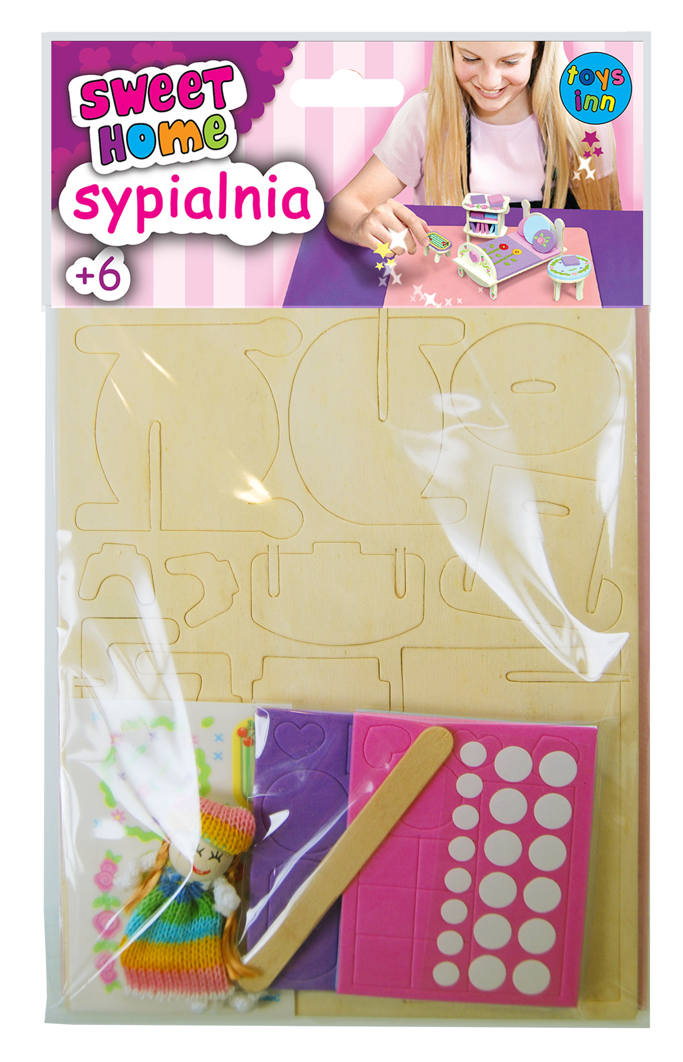 Mebelki drewniane dla dzieci. Zestaw zawiera drewniane elementy z których złożysz zestaw mebli do sypialni . Dodatkowo w zestawie: piankowe elementy do klejenia ,szpatułka oraz laleczka drewniana.