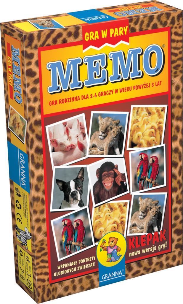 MEMO to polska wersja wspaniałej gry znanej na całym świecie. Tym razem ilustrowana pięknymi zdjęciami zwierząt z całego świata, a ponadto - po raz pierwszy - jej nowa, dynamiczna wersja - KLEPAK.