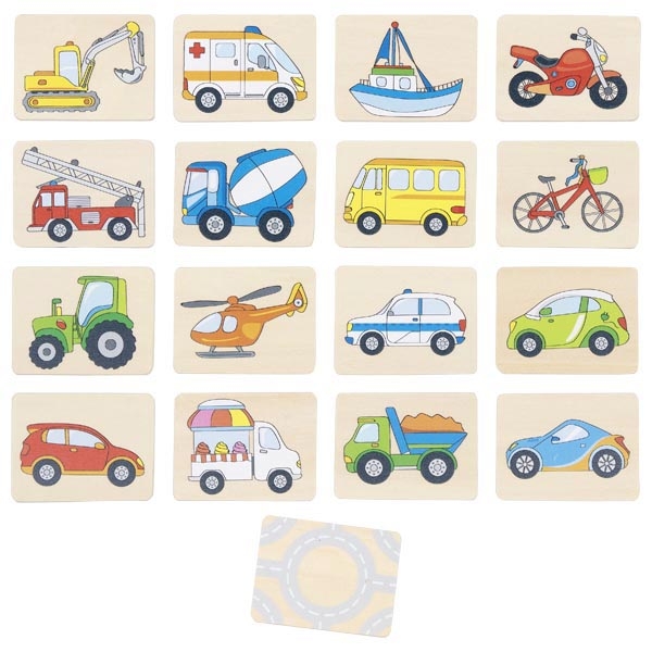 Opis produktuZasady bezpieczeństwa32 drewniane karty z wizerunkami różnych pojazdów. Idealne dla małych fanów motoryzacji, ćwiczą pamięć i refleks. Gra wspiera koordynację wzrokową oraz rozwija słownictwo, gdy dziecko nazywa poszczególne pojazdy. Karty układamy do dołu obrazkiem, następnie odkrywamy po dwa i gdy znajdziemy dwa takie same to zabieramy parę. Jeśli nie znajdziemy, odkładamy karty obrazkiem do dołu i kolej na ruch drugiego gracza. Zadanie polega na znalezieniu dwóch takich samych kart. To gra znana pod nazwą memo lub memory. x
