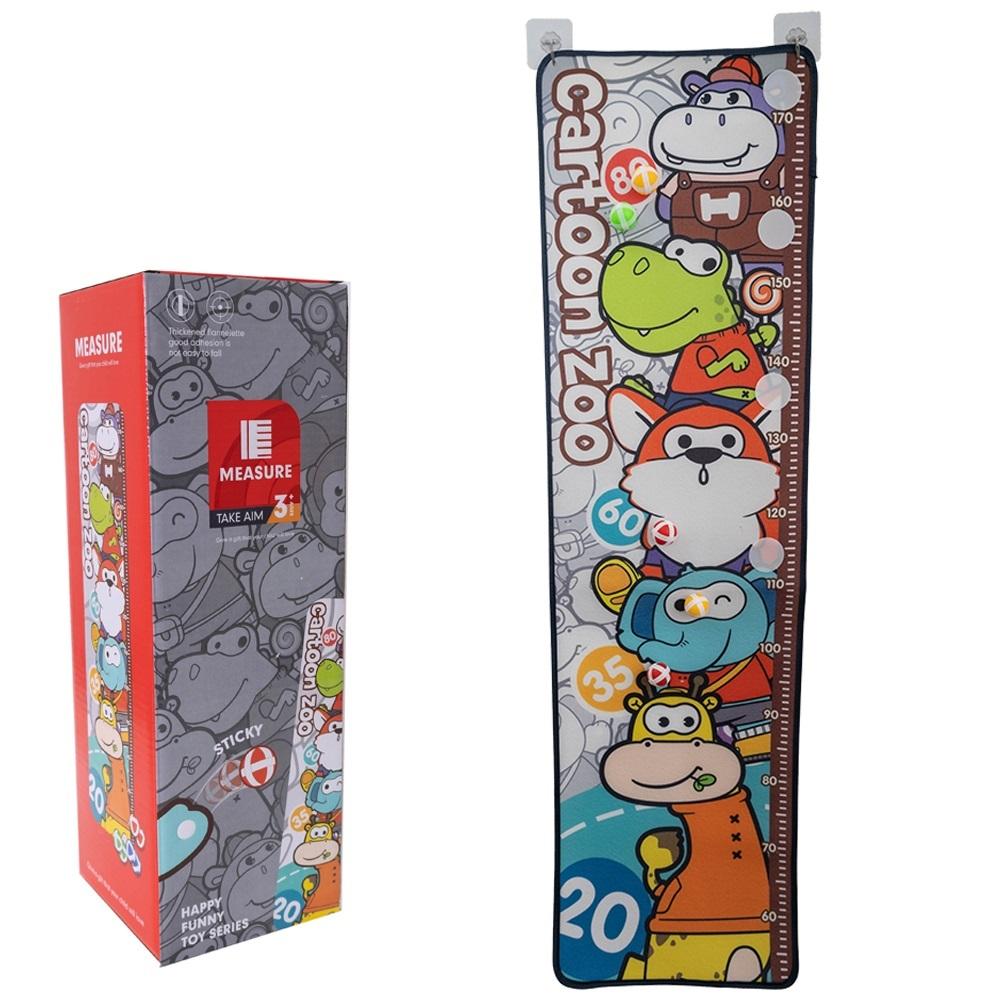Opis produktuZasady bezpieczeństwaMiarka wzrostu, pakowana w kolorowe pudełko W zestawie: mata o wymiarach 35.5 x 127 cm; 6 piłeczek z rzepami, 6 naklejek + 4 rzepy do oznaczania wzrostu; 2 haczyki do powieszenia miarki Wymiary opakowania: 12.2 x 12.2 x 36.5 cm x