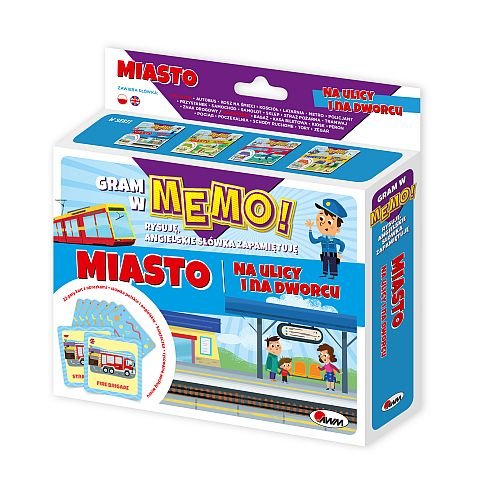 Ten zestaw edukacyjny dotyczy tematyki MIASTA, a w szczególności przestrzeni ULICY i DWORCA. GRA MEMO składa się z 22 PAR KART z obrazkami i słówkami polskimi i angielskimi. Wygrywa ten gracz, który dopasuje NAJWIĘKSZĄ LICZBĘ PAR takich samych obrazków. KSIĄŻECZKA zawarta w zestawie pozwala trenować umiejętność RYSOWANIA i KOLOROWANIA oraz POWTARZAĆ SŁÓWKA.