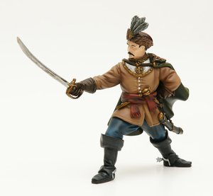 Opis produktuZasady bezpieczeństwaFigurka przedstawiająca postać literacką z Trylogii Henryka Sienkiewicza osadzonej w realiach siedemnastowiecznej Rzeczpospolitej. Pojawia się we wszystkich jej częściach: „Ogniem i mieczem”, „Potopie” i w „Panu Wołodyjowskim”. Pierwowzorem sienkiewiczowskiego bohatera był Jerzy Wołodyjowski, polski szlachcic i żołnierz, uczestnik obrony Kamieńca Podolskiego przed Turkami w 1672 r. Michał Wołodyjowski, z racji niskiego wzrostu zwany Małym Rycerzem, był oficerem dragonów i wyśmienitym szermierzem. Podobnie, jak jego pierwowzór zginął podczas oblężenia kamienieckiej twierdzy (wysadził się w powietrze po jej upadku). Wołodyjowski ubrany jest w skórzany kolet, czapkę magierkę, na szyi ma zawieszony obojczyk/ryngraf. Uzbrojony w polską szablę husarską. Za pasem buzdygan – oznaka władzy oficerskiej w dawnej Rzeczpospolitej. Figurka wykonana w jakości kolekcjonerskiej, jednocześnie spełnia wymogi norm dla zabawek od 3 roku życia. Patronat nad kolekcją objęło Muzeum Wojska Polskiego. x