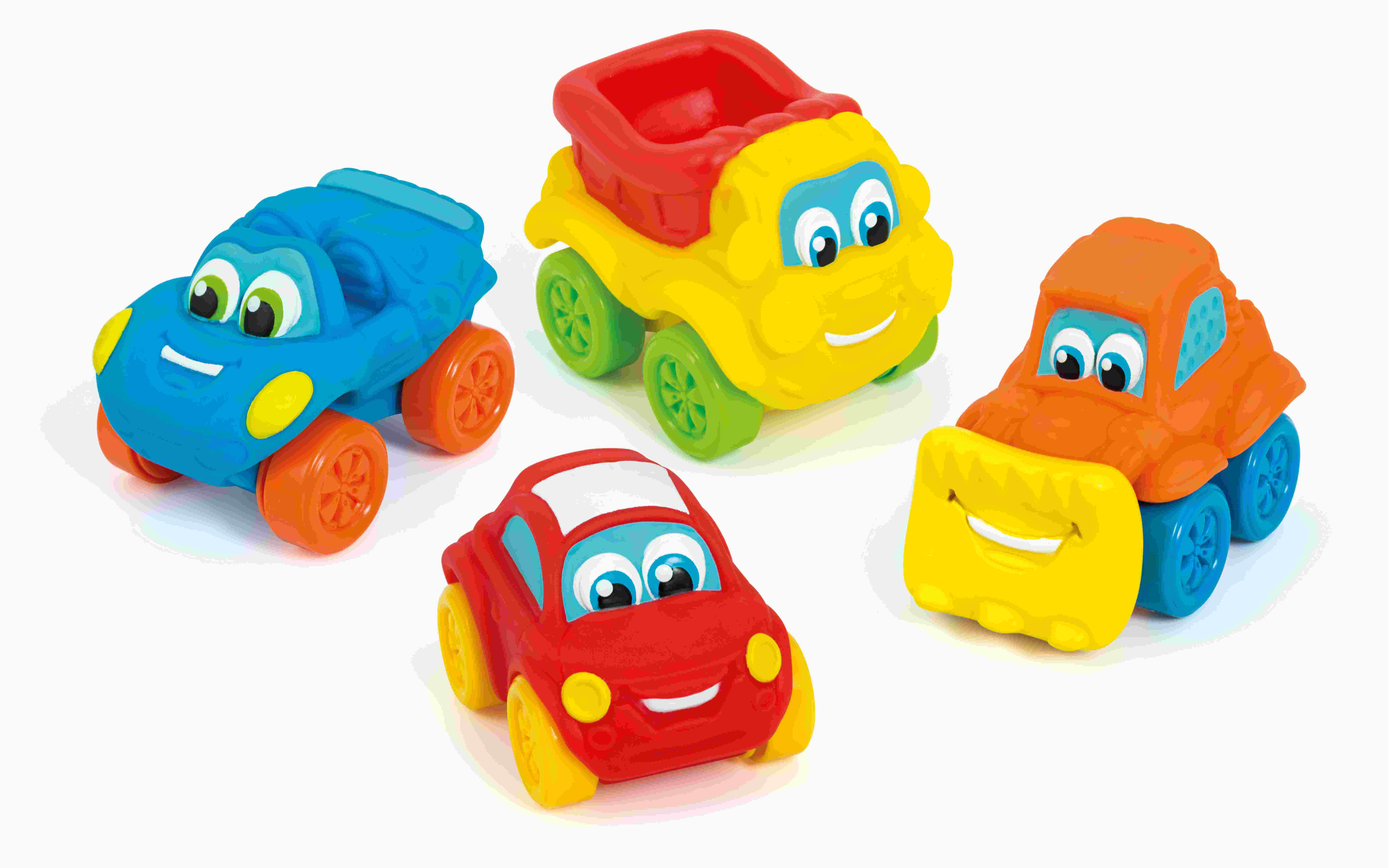 Cztery nowe mięciutkie, kolorowe samochodziki dla dzieci. Inspirowane różnymi modelami samochodów i pojazdów: samochód miejski, ciężarówka, koparka i samochód wyścigowy. Rozwijają zdolnośći manualne i percepcję wzrokową.