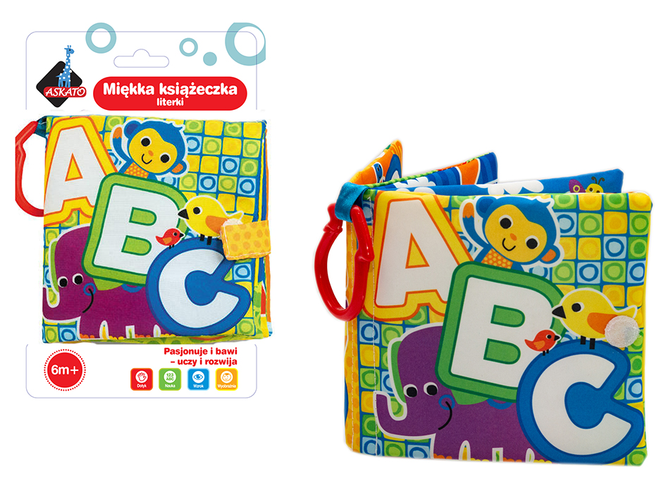 Wykonana z miękkiego, przyjemnego w dotyku materiału, w żywych kolorach, szeleszcząca z wszytym piszczkiem. Na każdej z 8 stron znajdują się kolorowe obrazki, zamykana na rzep.