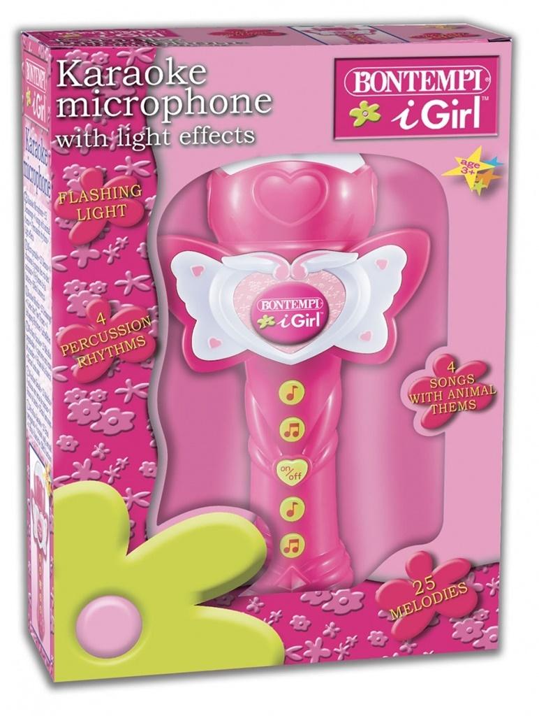 Dziecięcy mikrofon dla dziewczynek włoskiej firmy bontempi, zawierający 25 piosenek demo oraz 4 rytmy perkusyjne. Po naciśnięciu odpowiedniego przycisku mikrofon będzie także świecił, co pozwoli dziewczynce poczuć się jak jej ulubiona piosenkarka. Do prawidłowego działania zestaw wymaga 3 baterii AA, które nie są dołączone do zestawu. Wymiary produktu: 9,5 x 17,5 x 5,7 cm.
