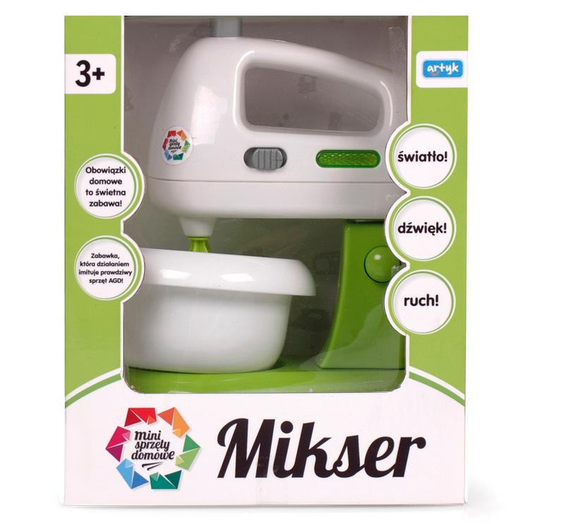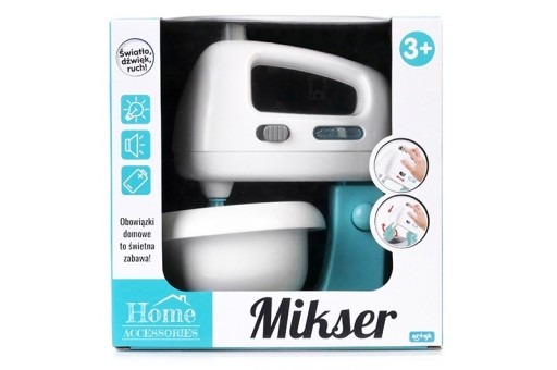 Ruchomy mikser z dołączoną miską, zabawka umieszczona w uchwycie może zostać wyjęta i stosowana jako mikser ręczny.