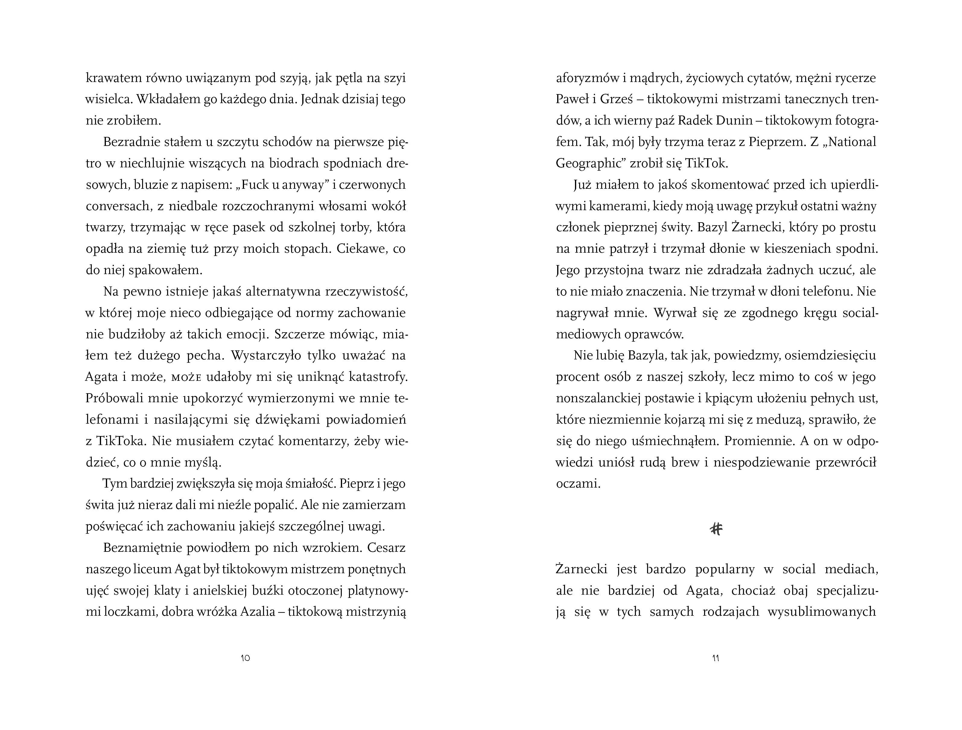 Opis produktuZasady bezpieczeństwaBazyl nie jest najsympatyczniejszą osobą w szkole. Zawsze mówi to, co myśli, bywa oschły, nie zależy mu też na tym, aby ktoś go lubił czy się w nim zakochał. Należy jednak do najpopularniejszej licealnej grupy, która rządzi na TikToku i stwarza pozory idealnego życia. Maks gardzi ich sławą. Zwłaszcza, że jego myśli zaprząta teraz młody polonista. To jemu chce zaimponować. Nie może więc odmówić, gdy dostaje do napisania pracę na temat social mediów. Na swoje nieszczęście musi zbliżyć się do Bazyla i jego znajomych. Na jaw wychodzą wtedy tajemnice szkolnych tiktokerów: udawane związki, zdrady i intrygi, publiczne cancele oraz mroczne kulisy bycia influencerami. A w tym wszystkim pojawia się uczucie, z którym nie można walczyć Nieoczekiwanie Maks i Bazyl muszą zmierzyć się z czymś, co wydaje się ich przerastać. Pod maską niedostępności i zblazowania ukrywają najprostsze pragnienie, żeby ktoś ich pokochał i zaakceptował. Nikt w grupie nie jest tym, za kogo się podaje. CZY Z RÓŻNYCH ŚWIATÓW, DO KTÓRYCH NALEŻĄ, BĘDĄ POTRAFILI STWORZYĆ JEDEN WSPÓLNY? x