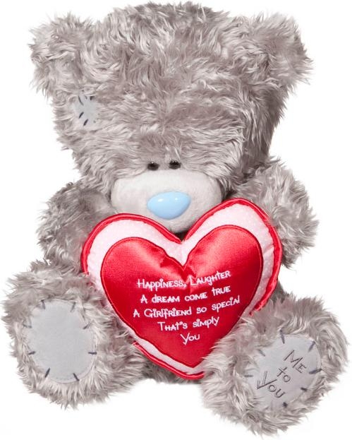 Oto pocieszny pluszowy miś. Niedźwiadek trzyma w łapkach czerwone serduszko, na którym widnieje napis: „Happiness, Laughter A dream come true A Girlfriend so special That’s Simple You". Podziel się ze swoją sympatią swoimi uczuciami, tym jaki jesteś dzięki niej szczęśliwy. Wyraź swoje przywiązanie, doceń jej uśmiech, niech wie, że razem z misiem dostaje część Twojej osoby.