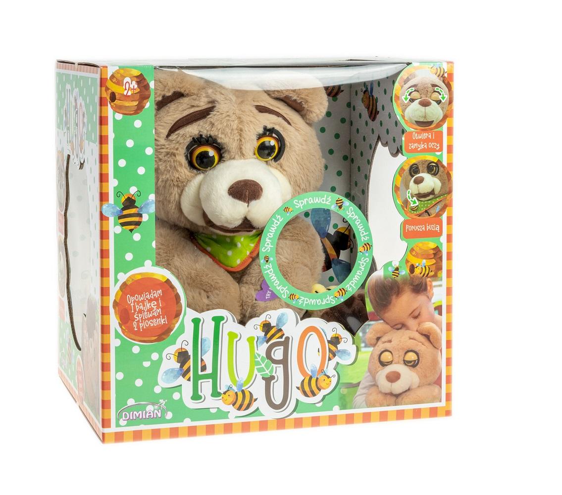 Opis produktuZasady bezpieczeństwaMiś Hugo jest duży i miękki. Mówi po polsku. Po naciśnięciu łapki opowiada bajki o ,,Złotowłosej"" i ,,Trzech Misiach"". Śpiewa piosenki: ,,Jedzie pociąg z daleka"" i Panie Janie"". Hugo porusza oczami i buzią. Miś Hugo Miękki, łączy w sobie funkcję przytulanki, i gawędziarza. Pokryty jest wyjątkowo miękką i przyjemną w dotyku tkaniną. Hugo może stać się prawdziwym przyjacielem dziecka: