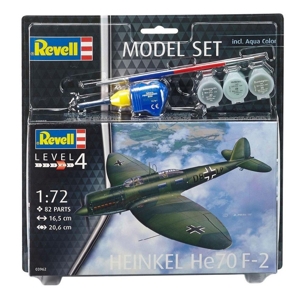 Heinkel He 70 F-2 - niemiecki samolot kurierski i rozpoznawczy z okresu II wojny światowej. Zalecane kolory farb: 32108, 32109, 32145, 32177, 32183, 32199. Skala 1:72, ilość elementów 82 Długość: 16,5 cm Rozpiętość skrzydeł: 20,6 cm Plastikowy model do sklejania Revell ( REV-63962 ). x