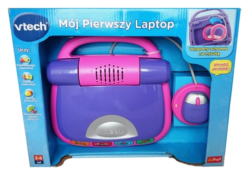 'Mój pierwszy Laptop' w kolorze różowo-fioletowym firmy VTech to pełna atrakcji zabawka i pierwszy komputerek dla Twojego maluszka.Mój pierwszy Laptop zawiera 30 zabaw edukacyjnych podzielonych na 4 kategorie. Zabawy w ciekawy i zachęcający sposób rozwijają umiejętności dziecka pisanie i znajomość alfabetu, logiczne myślenie, liczenie oraz samodzielną zabawę. Maluch uczy się również prostych czynności związanych z obsługą komputera. Dziecko łatwo może wybrać zabawę posługując się myszką. Zabawy pełne są wesołych dźwięków umilając czas spędzony na zabawie i nauce.Wygodna, obrotowa myszka dostosowana jest dla dzieci prawo i leworęcznych. Klawiatura zawiera na przyciskach do pisania obrazki przedmiotów, których nazwy rozpoczynają się na daną literkę, a przycisk powtórzenia ułatwi ponowne wybranie zabawy, dzięki czemu dziecko szybciej przyswoi nowe zagadnienia. Wesołe, dziecięce kolory i dźwięki sprawią, że laptop stanie się obowiązkowym towarzyszem poznawania świata. zabawka interaktywna dedykowana dzieciom w wieku od 3 do 5 lat.