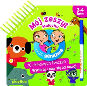 Mój zeszyt Maluchy 3-4 lata"" z serii ""Mali geniusze"" to : 70 ciekawych ćwiczeń na sucho ścieralnych stronach, sucho ścieralny pisak Zadania rozwijające umiejętności ćwiczone w przedszkolu, np.: rysowanie, pisanie, liczenie, wnioskowanie oraz wypowiadanie się. Duża różnorodność ćwiczeń: pokonywanie labiryntów, łączenie elementów, rysowanie po śladzie, znajdowanie różnic. Wycieraj i baw się od nowa!