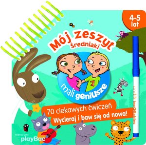 Mój zeszyt Średniaki 4-5 lat"" z serii ""Mali geniusze"" to : 70 ciekawych ćwiczeń na sucho ścieralnych stronach, zmywalny pisak Zadania rozwijające umiejętności ćwiczone w przedszkolu, np.: rysowanie, pisanie, liczenie, wnioskowanie oraz wypowiadanie się. Duża różnorodność ćwiczeń: pokonywanie labiryntów, łączenie elementów, znajdowanie różnic, rysowanie po śladzie, rozpoznawanie liter i cyfr... Wycieraj i baw się od nowa!