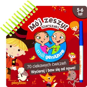 Mój zeszyt Starszaki 5-6 lat"" z serii ""Mali geniusze"" to : 70 ciekawych ćwiczeń na sucho ścieralnych stronach, zmywalny pisak Zadania rozwijające umiejętności ćwiczone w przedszkolu, np.: rysowanie, pisanie, liczenie, wnioskowanie oraz wypowiadanie się. Duża różnorodność ćwiczeń: pokonywanie labiryntów, kontynuowanie szlaczków, łączenie elementów, znajdowanie różnic, pisanie prostych słów. Wycieraj i baw się od nowa!