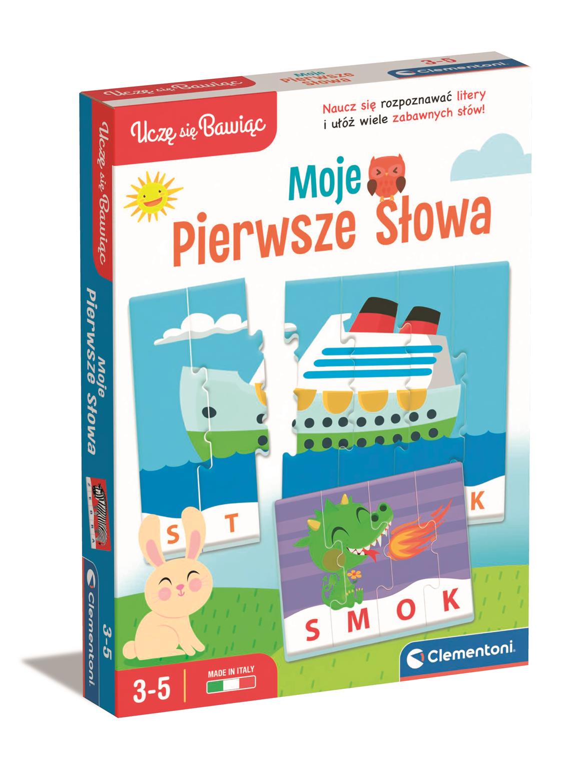 Opis produktuZasady bezpieczeństwaMoje Pierwsze Słowa to prosta i zabawna gra edukacyjna złożona z 16 układanek opracowanych po to, by dzieci w wieku od 4 do 5 lat nauczyły się kojarzyć litery oraz układać pierwsze słowa. Kolorowe ilustracje i zabawne postacie stymulują dziecko do układania obrazków i odkrywania wraz z każdym elementem liter składających się na dane słowo. Wycięcia puzzli umożliwiają autokontrolę i pozwalają dziecku na samodzielne sprawdzenie poprawności swoich wyborów. Dziecko może bawić się samo, a także w towarzystwie przyjaciół i rodziny dzięki wariantom gry dla grupy. To zabawa, która się nigdy nie kończy! x