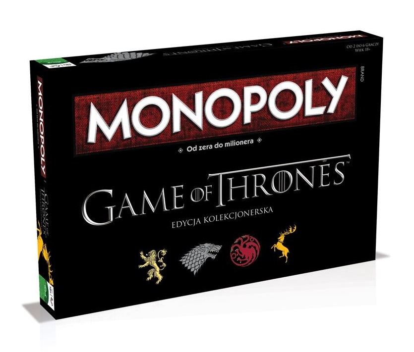 Nadchodzi zima! Wciel się w rolę jednego z rodów znanych z powieści George'a R. R. Martina i zbobywaj ziemie, miasta i warownie Westeros. Najnowsza kolekcjonerska edycja Monopoly od Winning Moves przenosi nas w świat znanego na całym świecie serialu HBO bazującego na powieści - ,,Gra o Tron"".Gra ta znana jest praktycznie wszystkim na całym świecie, a zasady gry są bardzo proste. To idealny prezent dla każdego fana Gry o Tron i nie tylko! Plansza gry przedstawia serialowy świat czyli Westeros. Na tradycyjnych polach nieruchomości mamy zamki i miasta takie jak Winterfell, Czarny Zamek, Quarth czy Królewską Przystań. Popularne koleje zamieniają się w domy rodów: Starków, Lanisterów, Baratharionów i Targarianów. Na kartach Valar Morghulis czy Żelażny Tron możemy spotkać cytaty z książki ,,On nie był żadnym smokiem, ogień nie zabija smoka"". W skład gry wchodzą wysokiej jakości metalowe pionki do gry, plastikowe figurki warowni i wiosek, karty nieruchomości, banknoty, kostki, plansza.