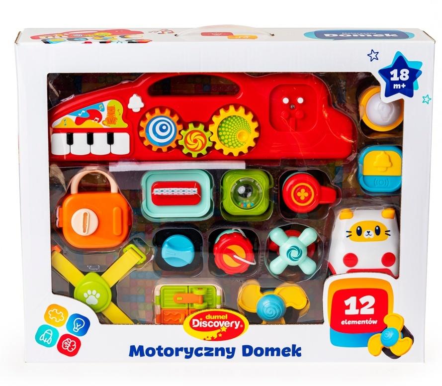 Opis produktuZasady bezpieczeństwaDomek stworzony z myślą o miłośnikach klocków i zręcznościowych niespodzianek! W zestawie znajdziemy dużą płytkę z wypustkami ściankę domku, do której można przypiąć klocki z motorycznymi zadaniami. Na małe paluszki czeka wiatraczek do obracania, zasuwki do przesuwania, klamerka do zapinania, element do przekręcania i wiele więcej! Dach domku wyposażony został nie tylko w praktyczny uchwyt do przenoszenia zabawki, ale także w dźwiękowy panel z mini pianinkiem i miejscem na przypięcie jednego z dwóch aktywnych klocków z dzwoneczkiem lub lampką. Dodatkowo znajdziemy tu też trybiki do przekręcania. To jeszcze nie wszystko! Poza domkiem i klockami, w skład zestawu wchodzi też pojazd z miejscami do przypięcia ulubionych, zręcznościowych klocków, żeby mogły one towarzyszyć maluchowi podczas podróży, dbając o sprawność jego paluszków.