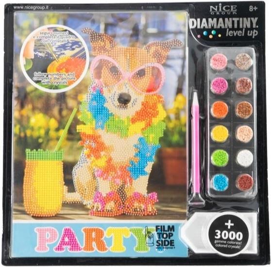 Zestaw z kryształkami do tworzenia mozaiek z kolorowymi kamieniami. Zabawa z mozaiką diamentową polega na układaniu obrazka z tysięcy malutkich, kolorowych diamencików według naniesionego na kartonie nadruku. Obrazek pokryty jest warstwą klejącą, która utrzymuje kryształki na odpowiednich miejscach. Kompletny zestaw do wykonania mozaiki zawiera: obrazek nadrukowany na grubej tekturze, na którym naniesione są literki i cyferki wskazujące miejsca, gdzie należy ułożyć poszczególne kolory; diamenciki w różnych kolorach; aplikator z woskiem, pojemnik na diamenciki oraz przewodnik po kolorach.