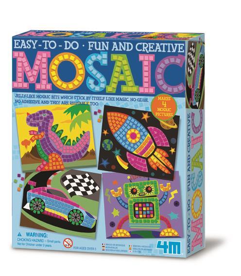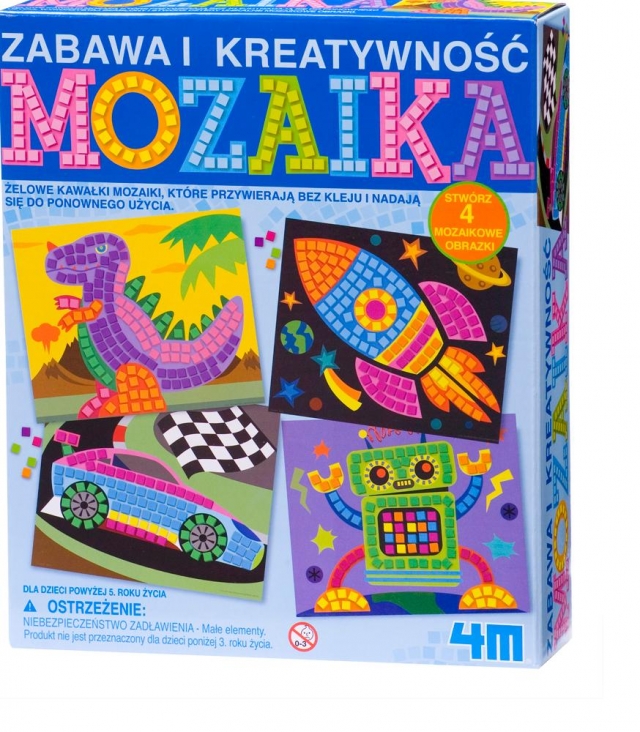 Stwórz wyjątkowe mozaiki bez użycia kleju i taśmy samoprzylepnej! Czy to w ogóle możliwe? Z zestawem od 4M jak najbardziej!Wraz z podstawą do stworzenia mozaiki otrzymujesz od nas szablony z kwadracikami, którymi w łatwy sposób wypełnisz obrazki. Kwadraciki pokryte są specjalną substancją, która sprawia, że łatwo przyklejają się do mozaiki.Nie przejmuj się, jeżeli niezbyt dokładnie umieścisz kwadraciki na obrazku! Z łatwością oderwiesz je od podstawy i przykleisz jeszcze raz, w odpowiednie miejsce!Wraz z zestawem stworzysz aż cztery barwne mozaiki!Ten zestaw to doskonała propozycja dla tych, którzy dopiero zaczynają przygodę ze sztuką. Krok po kroku nauczysz się wykonywać mozaikę i z łatwością osiągniesz wyjątkowy efekt!Uwagi: Powyżej 3. roku życia.Zawartość: 8 kolorowych zestawów kwadracików, 4 szablony i 4 podstawki. Wystarcza do wykonania 4 obrazków o wymiarach: 20cm x 17cm