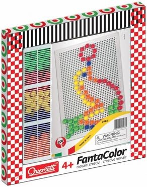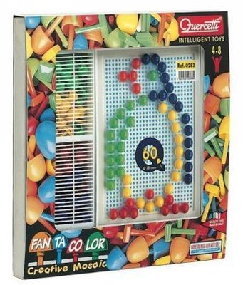 Tworzenie mozaiki poprzez wstawianie kołeczków w perforowaną tablicę jest wspaniałą i twórczą zabawą, która stymuluje rozpoznawanie kolorów, rozwija umiejętności manualne oraz koordynację ruchową. Kołeczki znajdują się w trzech przegródkach. Wszystkie elementy wykonane są z tworzywa wysokiej jakości, są elastyczne i zmywalne, mają zaokrąglone brzegi, są nietłukące i bezpieczne.