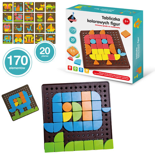 Opis produktuZasady bezpieczeństwaMozaika - układanka geometryczna to zabawka rozwijająca kreatywność małych dzieci, kształtująca wyobraźnię, ucząca wytrwałości i koncentracji oraz umiejętności manualnych. Układanka stymuluje motorykę małej ręki - sprawność dłoni i paluszków. Żywe kolory oraz różnorodność obrazków do odwzorowania zachęca dziecko do zabawy i uczy nazywania i rozpoznawania kształtów i kolorów. Zestaw zawiera 170 części. Znajdują się w nim podstawowe figury w 5 podstawowych kolorach. Zabawka zawiera 20 przykładowych schematów, dzięki którym dziecko rozpoznaje informacje, segreguje je uczy się wyodrębniać to co istotne i łączy wszystko w całość tworząc kompletny szablon. x