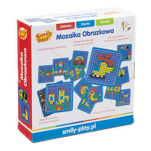 Zacznij kreatywną zabawę! Wyjmij plastikowy pojemnik i otwórz pokrywę. Wyjmij kolorowe elementy mozaiki i umieść w przegródkach. Wybierz jedną z 36 kart z obrazkami i zacznij zabawę umieszczając kwadratowe elementy w odpowiednie miejsca.
