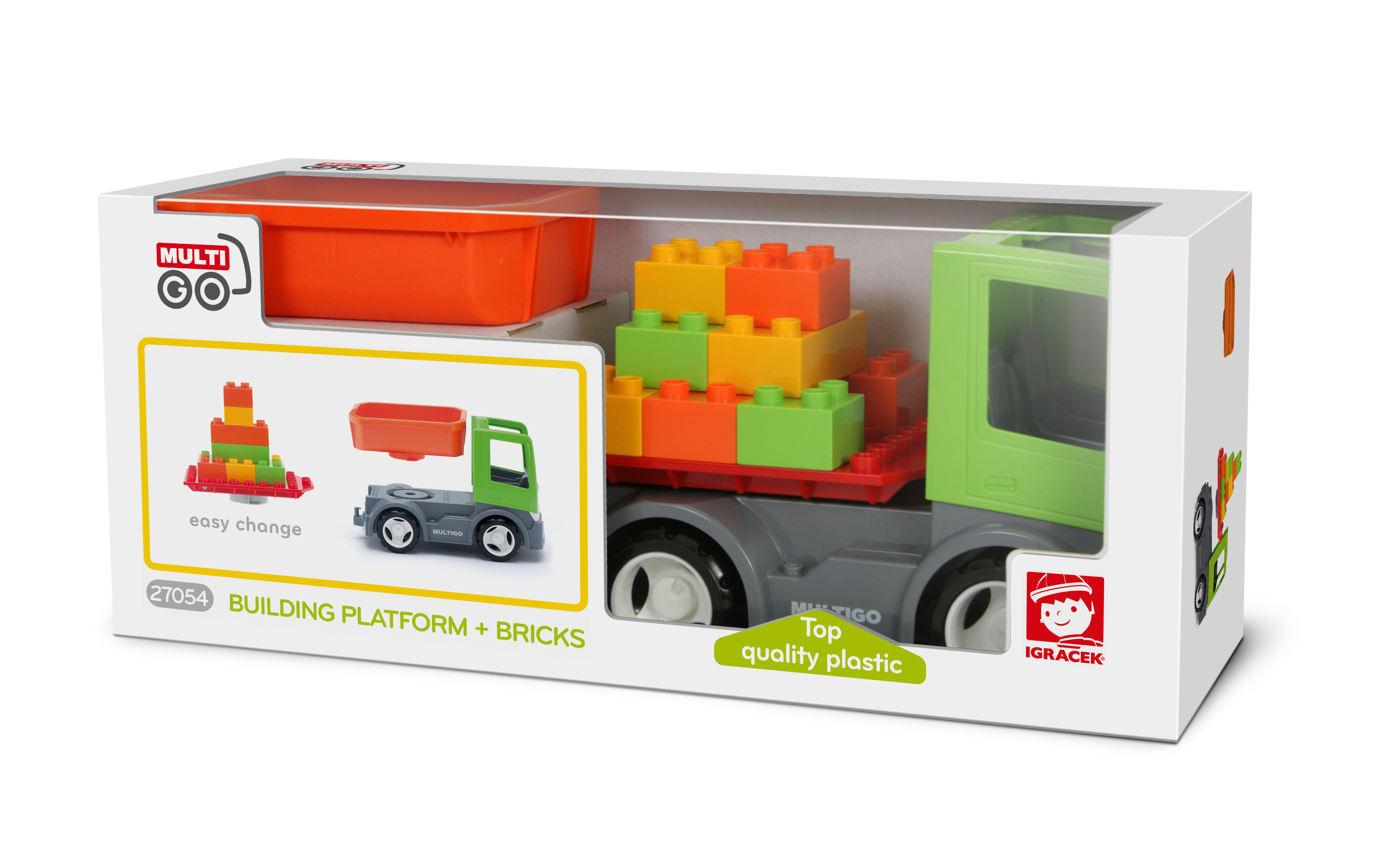 MultiGO to linia samochodów ciężarowych z poręcznym systemem bayonet, który umożliwia małym dzieciom wymianę rozszerzeń i innych akcesoriów.