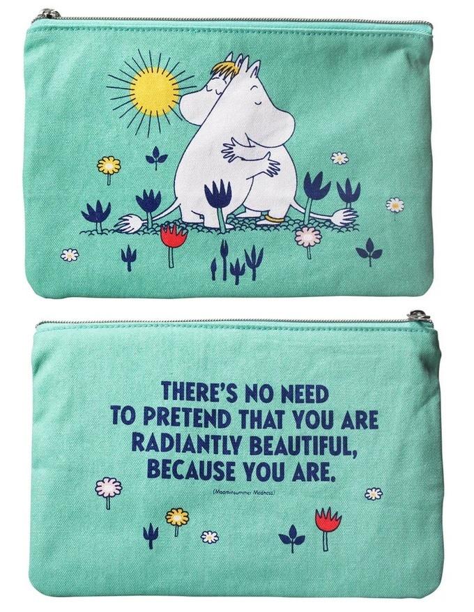 Haftowana saszetka wykonana z bawełny z recyklingu, której motywem przewodnim jest ciepłe objęcie postaci Muminka i Migotki. Kompozycja z romantycznym akcentem - Muminki w uścisku otoczone kwiatowymi detalami, natomiast na odwrocie inspirujący cytat. Zamykana metalowym suwakiem i zaprojektowana z myślą o ekologii, ta saszetka o wymiarach 16,5 24 cm została opracowana przez twórców kultowych Muminków, stając się nie tylko praktycznym akcesorium, ale i artystycznym akcentem dnia codziennego - zarówno do trzymania przyborów, kosmetyków czy drobiazgów. x