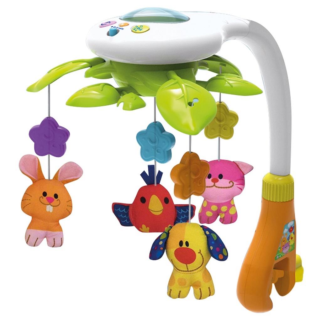 Karuzelka dla niemowlaka to zabawka typu 2 w 1: muzyczna karuzelka i projektor z rzutnikiem. Karuzelka obraca się, grając spokojne melodie. Materiałowe zwierzątka powoli przesuwają się. Projektor wyświetla na suficie obrazki, których kolory powoli zmieniają się. Zabawka pomaga dziecku zasnąć. Łagodne światło oraz delikatne dźwięki pomogą uspokoić naszego maluszka.