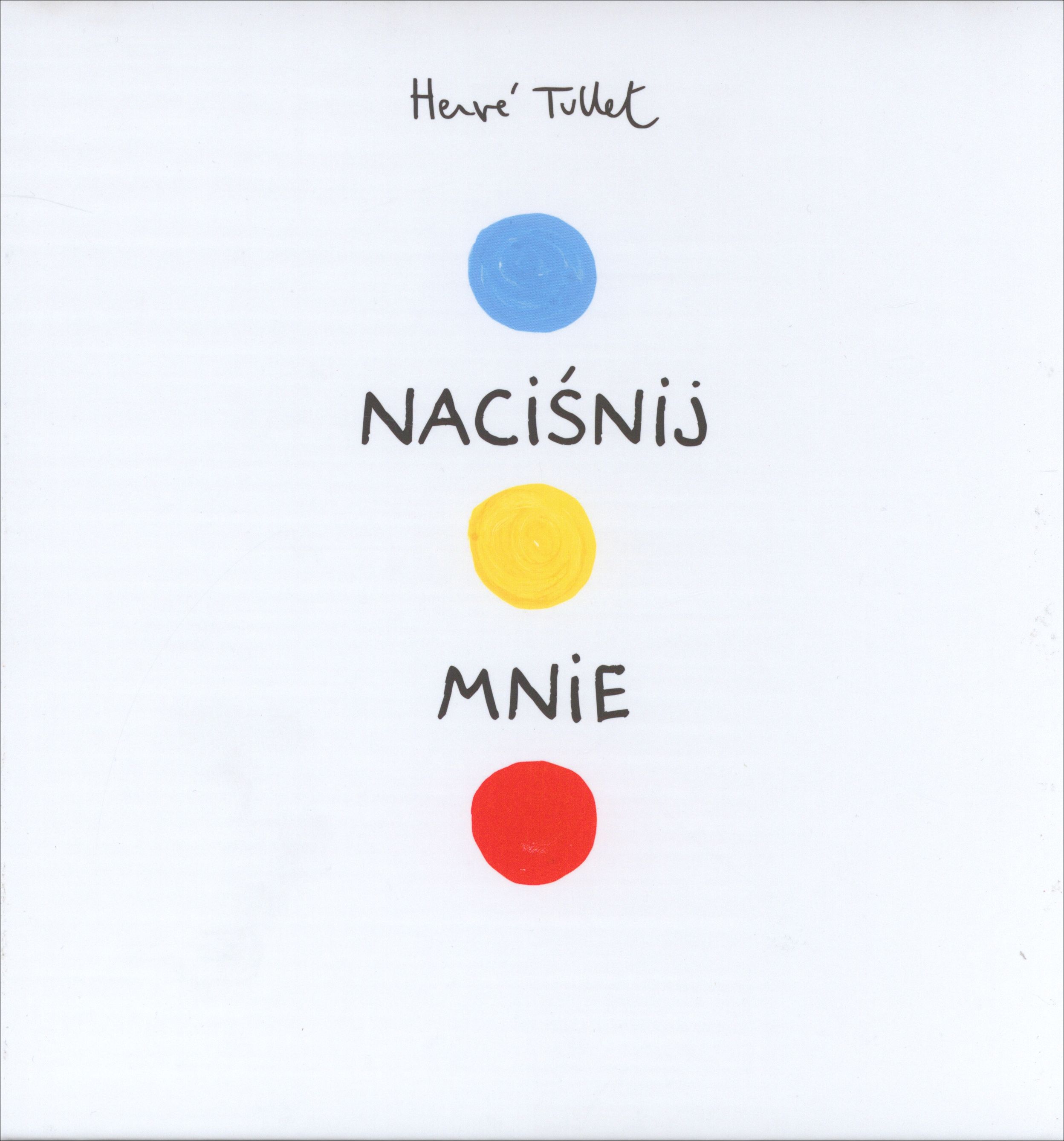 MNIE szybko stała się międzynarodowym hitem, a jej autor - Herve Tullet - jednym z najbardziej znanych i uwielbianych autorów książek dla dzieci. Interaktywna, kreatywna, edukacyjna - zachęca dzieci oraz dorosłych do wspólnej zabawy i nauki. To książka, którą trzeba przekręcać, na którą trzeba dmuchać, której trzeba klaskać... NACIŚNIJ MNIE została zaliczona do 10 najlepszych książek dla dzieci wg Amazon.com oraz do 11 najlepszych książek przez opiniotwórczy blog Huffington Post. Nagroda Główna w kategorii Kultura w konkursie Świat Przyjazny Dziecku zorganizowanym przez Komitet Ochrony Praw Dziecka. Laureat plebiscytu czytelników miesięcznika ""Dziecko"" (AGORA) - NAJLEPSZY PRODUKT ROKU - w kategorii ""Najlepsza książka dla dzieci"". Wydanie polsko-francuskie. W serii ukazały się m.in.: KOLORY, FIGLE MIGLE, OCH! KSIĄŻKA PEŁNA DŹWIĘKÓW, TURLUTUTU MAGICZNE PRZYGODY, TURLUTUTU NA WAKACJACH, ABRAKADABRA TURLUTUTU! x