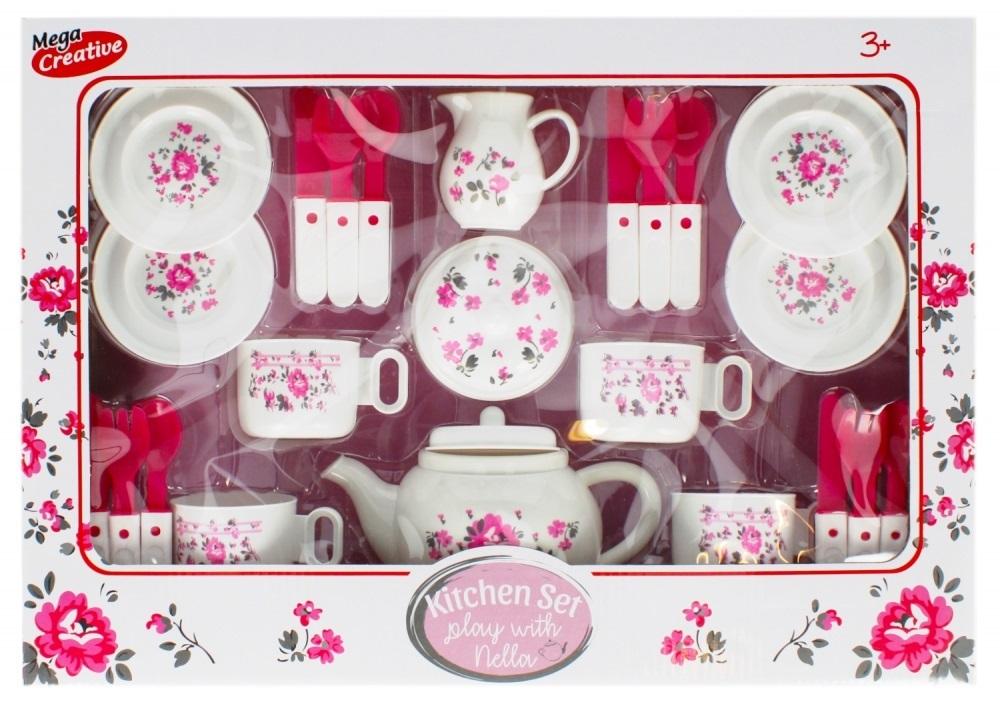 Opis produktuZasady bezpieczeństwaZalety produktu: rozwija kreatywność dziecka, pozwoli wcielić się dziecku w dorosłe życie i wykonywać podstawowe czynności domowe jak np. przygotowywanie kawy, herbaty. Zestaw kuchenny MEGA CREATIVE doskonale sprawdzi się podczas zabawy w przygotowanie pysznej herbatki, kawki. Tak bogate wyposażenie pięknych filiżanek i dzbanuszka może sprawić, że zabawa przerodzi się w prawdziwe przyjemne spotkanie przy herbatce! Zawartość zestawu: dzbanek, dzbanek na mleko, cukierniczka,4 x filiżanka, 4 x talerzyk, sztućce. Wymiary/waga/baterie: wymiary produktu (dł. x wys. x gł.)[cm]: czajnik 17x10x8, wymiar opakowania (dł. x wys. x gł.) [cm]: 46x32x8, waga produktu bez opakowania [kg]:0,25 kg, waga produktu w opakowaniu [kg]: 0,46 kg, nie wymaga zasilania bateriami. Zabawka przeznaczona dla dzieci w wieku: 3+. x