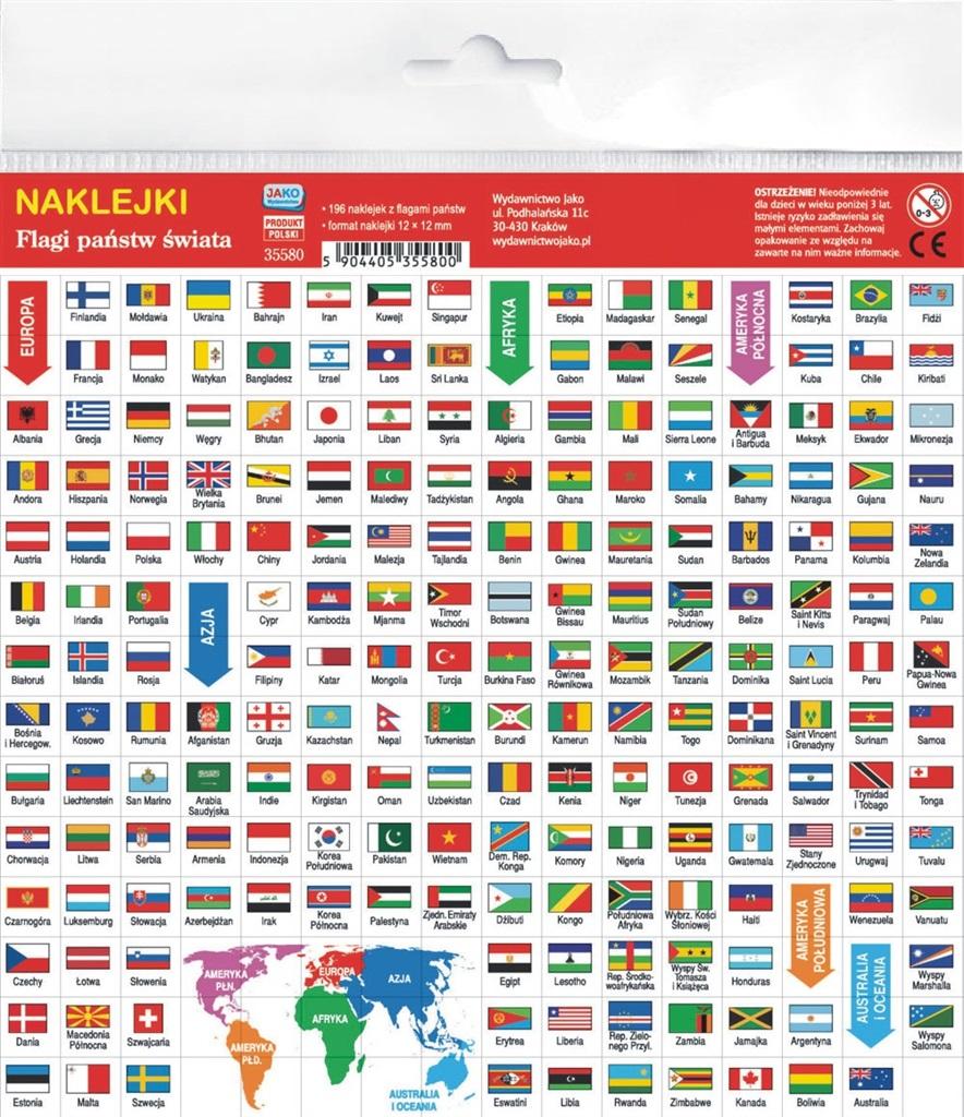 Opis produktuZasady bezpieczeństwaZestaw samoprzylepnych naklejek z flagami idealnie nadaje się do wszelkich prac kreatywnych. Naklejki mogą być używane do ozdabiania kartek okolicznościowych, prezentów, notesów, zeszytów oraz pudełek. Doskonale sprawdzą się także jako nagrody motywacyjne.Każda naklejka zawiera flagę oraz nazwę kraju. Format pojedynczej naklejki: 12 x 12 mm. x