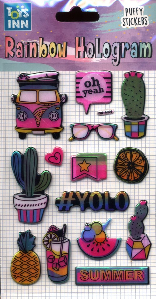 Opis produktuZasady bezpieczeństwaNaklejki holograficzne Summer, to idealna dekoracja pamiętników, albumów, zeszytów czy telefonów. W zestawie znajduje się około 10 szt kolorowych naklejek o różnych kształtach. Holograficzna powłoka z efektem tęczy zmienia ich kolory w zależności od kąta padania światła, dzięki temu naklejki są oryginalną, przyciągającą wzrok ozdobą. Naklejki wykonane zostały z wysokiej jakości materiałów, które są trwałe i odporne na zniszczenia