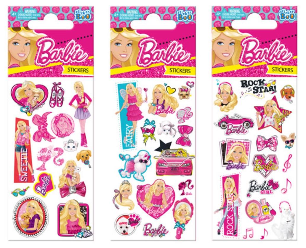 Naklejki z postaciami Barbie, ozdobione srebrną obwódką.