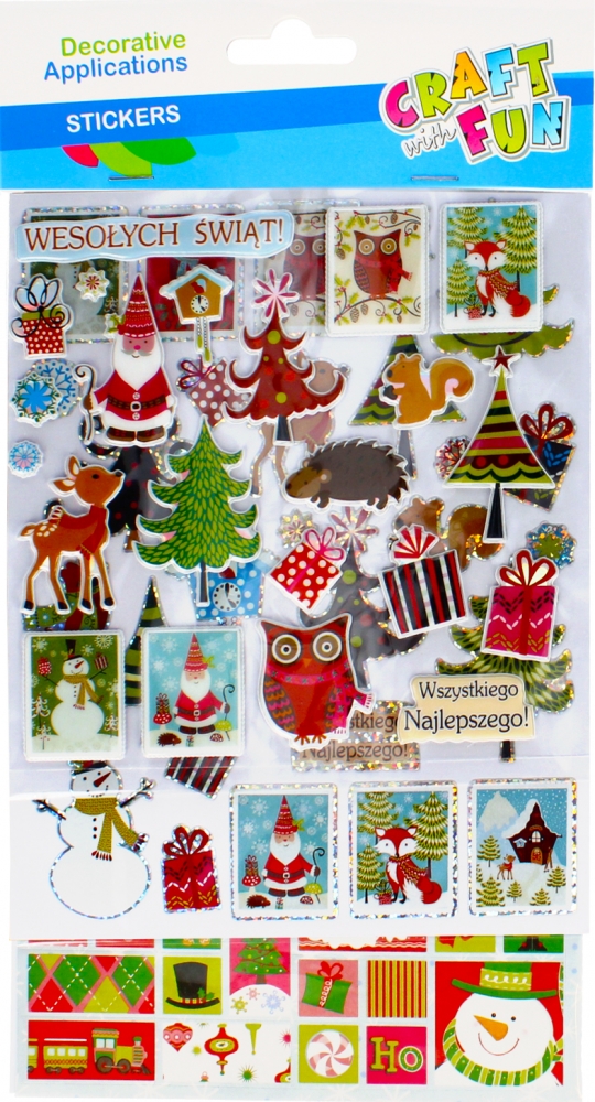 Opis produktuZasady bezpieczeństwaMiks wzorów, towar wysyłany losowo. Cena za 1 blister. Zalety produktu: doskonale nadają się do zdobienia kartek okolicznościowych, albumów lub wystroju wnętrza, idealne do zdobienia świątecznych prezentów. Naklejki dekoracyjne CRAFT WITH FUN to fantastyczna i kreatywna zabawa, która pobudzi wyobraźnię. Używaj tych produktów w połączeniu z innymi akcesoriami oraz kompletami z serii CRAFT WITH FUN! Zawartość opakowania: 3 woreczki z mixem naklejek. x