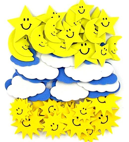Zestaw naklejek z pianki z motywami obrazującymi warunki pogodowe, w kilku różnych wzorach.