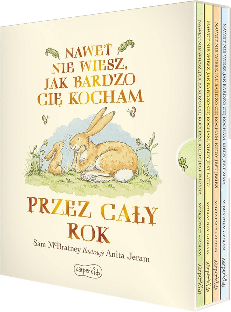 Opis produktuZasady bezpieczeństwaNiezwykła kolekcja czterech książek z bestsellerowej serii "Nawet nie wiesz, jak bardzo cię kocham" w nowym, złoconym etui prezentowym! To przepiękne, wyjątkowe pudełko zawiera wydane wcześniej osobno książki: - Nawet nie wiesz, jak bardzo cię kocham, kiedy jest wiosna, - Nawet nie wiesz, jak bardzo cię kocham, kiedy jest lato, - Nawet nie wiesz, jak bardzo cię kocham, kiedy jest jesień, - Nawet nie wiesz, jak bardzo cię kocham, kiedy jest zima. Opowieści autorstwa Sama McBratneya i Anity Jeram o Małym Brązowym Zajączku i Dużym Brązowym Zającu, ze zmieniającymi się porami roku w tle, są mądre, zabawne i porywające. To najlepszy prezent urodzinowy lub świąteczny, który z pewnością zachwyci każde dziecko! x