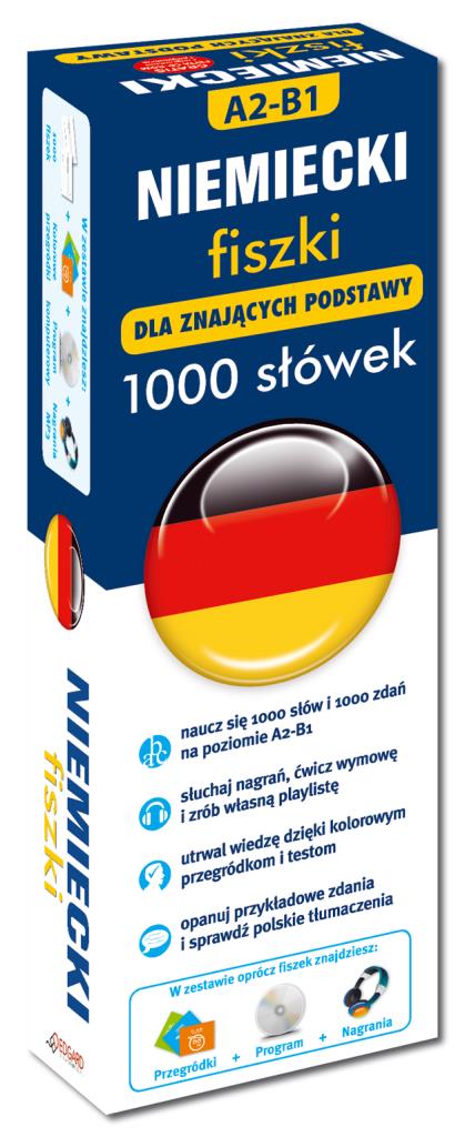 Dzięki nauce z fiszkami:- poznasz 1000 niezbędnych słów, dzięki którym zaczniesz swobodnie rozmawiać po niemiecku,- opanujesz 1000 zdań z tłumaczeniami - poznasz i powtórzysz gotowe wzorce komunikacyjne oraz użycie słów,- z programem Aktywny Trening stworzysz własną playlistę, którą przesłuchasz na dowolnym odtwarzaczu,- szybko i skutecznie opanujesz słownictwo z 39 grup tematycznych, - posłuchasz gotowych nagrań MP3 i przećwiczysz wymowę,- sprawdzisz prawidłową pisownię słów dzięki funkcji karaoke,- będziesz ćwiczył język o każdej porze i w dowolnym miejscu,- utrwalisz wiedzę za pomocą kolorowych przegródek i testów.Niemiecki fiszki 1000 słówek dla znających podstawy to wyjątkowy zestaw, który tworzą: ponad 1000 ponumerowanych fiszek, pudełko z kolorowymi przegródkami ułatwiającymi naukę oraz płyta z gotowymi nagraniami MP3, programem do generowania osobistej playlisty, funkcją karaoke i testami. Nauka z kursem pozwala skutecznie przyswoić niemiecki słownictwo na poziomie A2-B1. Opanowanie materiału umożliwia swobodną komunikację na poziomie podstawowym i średnio zaawansowanym. Do zestawu dołączony jest program Aktywny Trening z ćwiczeniami, który umożliwia tworzenie indywidualnych list nagrań, odsłuchiwanie ich na dowolnym odtwarzaczu i głośne powtarzanie za lektorem. Dodatkowo dzięki funkcji karaoke możesz sprawdzić na ekranie wyświetlacza prawidłową pisownię słówek. Rozwiązując testy aktywnie sprawdzisz stopień opanowania materiału z fiszek i skutecznie utrwalisz znajomość słownictwa. Kurs językowy z fiszkami to nie tylko skuteczna metoda aktywnego przyswajania niemieckiego słownictwa, ale również wygodny i atrakcyjny sposób na naukę w dowolnej chwili i czasie: w drodze do pracy, szkoły, w podroży czy na spacerze.