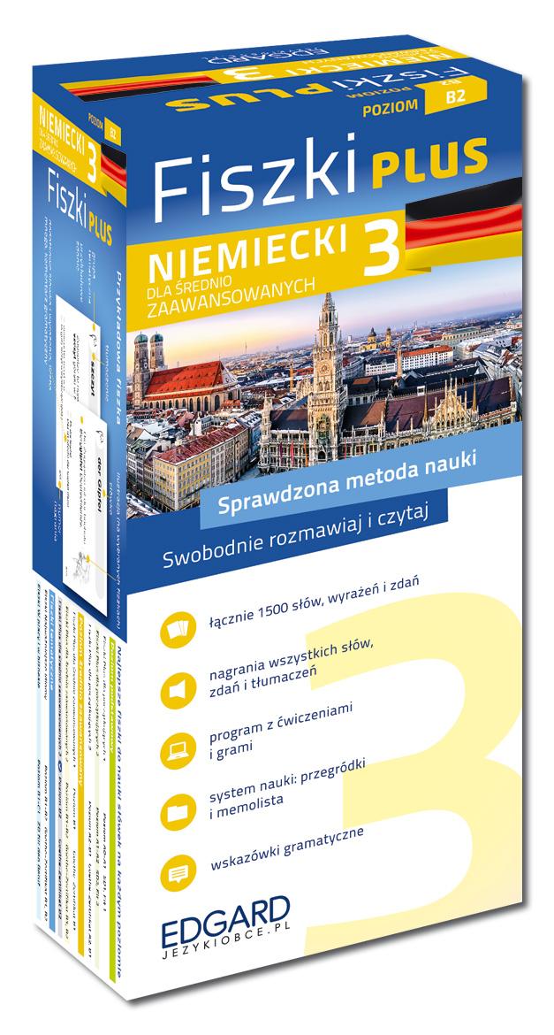 Niemiecki Fiszki PLUS dla średnio zaawansowanych 3 (B2) to pakiet będący częścią rozbudowanego systemu nauki, dzięki któremu szybko i skutecznie nauczysz się słownictwa na każdym poziomie zaawansowania. Każdy zestaw Fiszek PLUS to starannie przygotowany materiał, wysokiej jakości nagrania wymowy wraz z programem komputerowym, memolistą i grami językowymi.Z Fiszkami PLUS nie tylko zapamiętujesz słówka, lecz także poznajesz słownictwo w kontekście, uczysz się nieregularnych form oraz popularnych zwrotów językowych. Od dziś nauka języka stanie się przyjemnością!- Ucz się 1500 słów, wyrażeń i zdań poznaj użycie gotowe wzorce komunikacyjne, utrwal reguły gramatyczne.- Poznaj prawidłowa wymowę. Słuchaj nagrań wszystkich słówek i zdań oraz ich tłumaczeń- Utrwalaj materiał z ćwiczeniami i grami językowymi dostępnymi w programie (do pobrania)- Ucz się skutecznie dzięki systemowi kolorowych przegródek. Sprawdź na memoliście, które słówka już znasz!- Twórz własne playlisty nagrań wymowy i ucz się mobilnie w drodze do pracy lub szkoły!