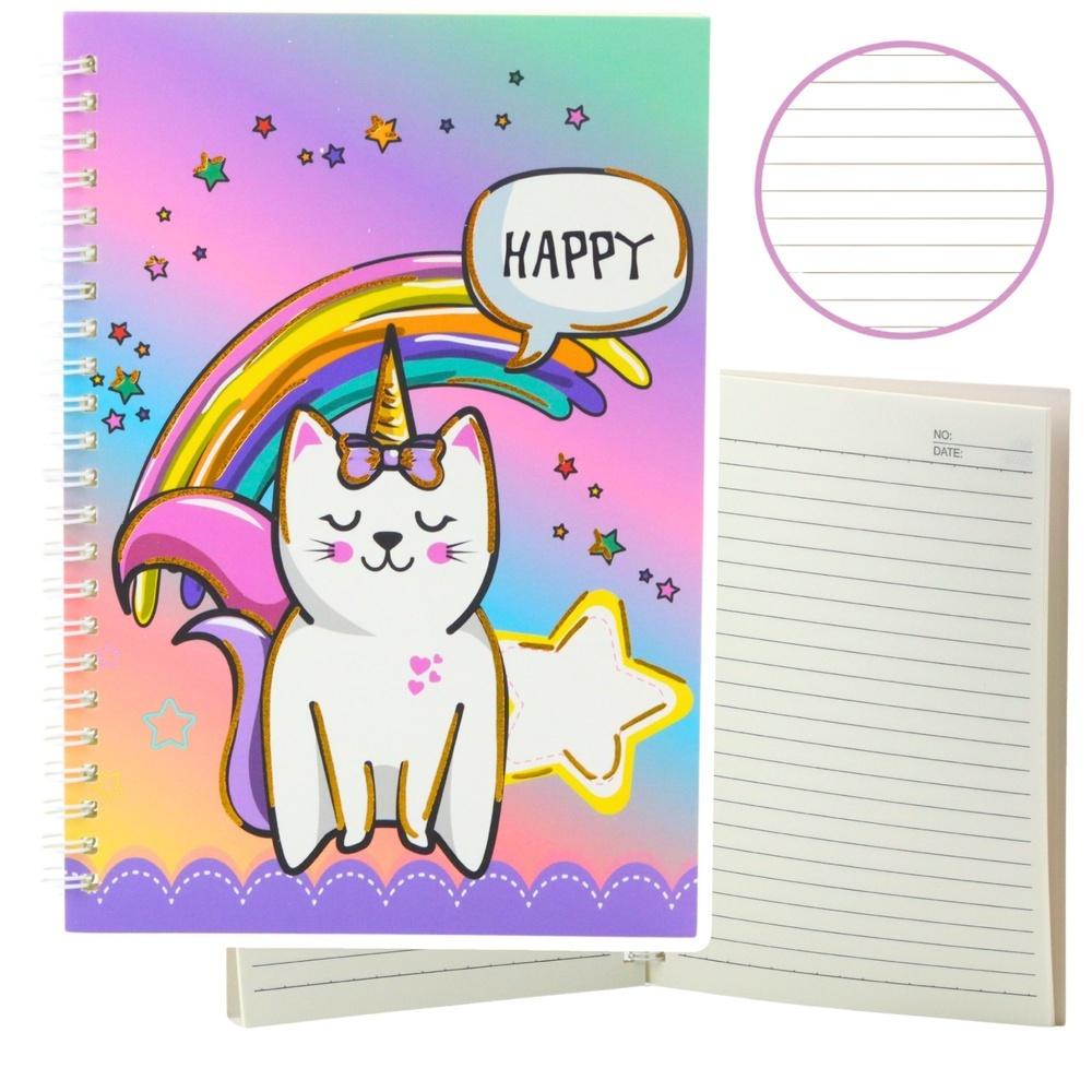 Opis produktuZasady bezpieczeństwaNOTATNIK / ZESZYT KOLOROWY Z KOTEM I TĘCZĄ W LINIE 60 KARTEK A5 Pełen radości i kolorów notatnik z uroczym motywem kota-jednorożca na tle tęczy to doskonały towarzysz codziennych zapisków, notatek i dziecięcych sekretów. Intensywne pastelowe barwy i zabawna ilustracja zachęcają do twórczości, sprawiając, że każde otwarcie zeszytu wywołuje uśmiech. To idealny wybór dla dzieci, które kochają bajkowe postacie, kolorowy świat i chcą wyrażać siebie poprzez pisanie, rysowanie lub planowanie. Zeszyt zawiera 60 kartek w linie, które doskonale sprawdzą się do notatek szkolnych, prowadzenia pamiętnika, czy kreatywnego rysowania. Okładka jest lekka, ale trwała, a spiralne bindowanie ułatwia otwieranie na płasko i wygodne pisanie na każdej stronie. Produkt łączy bajkowy wygląd z funkcjonalnością - będzie świetnym prezentem lub osobistym zeszytem do codziennego użytku. SPECYFIKACJA: Wzór okładki: Kot jednorożec z tęczą Rodzaj okładki: Kolorowa, papierowa, miękka Elementy dekoracyjne: Ilustracja kota, gwiazdek, tęczy i chmurki Rodzaj kartek: W linie Ilość kartek: 60 Kolor kartek: Biały z nagłówkiem Format: A5 Wymiary: 21 x 15 x 1 cm ZAWARTOŚĆ ZESTAWU: Notatnik / zeszyt - 60 kartek w linie x