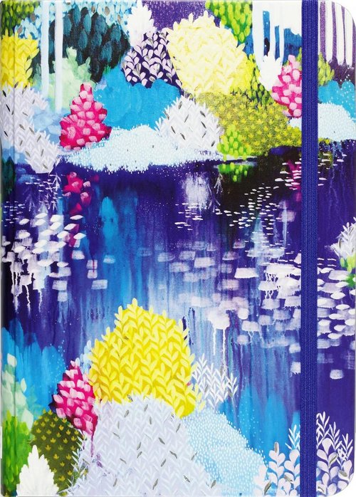 Lekko wyłożone strony o gładkim wykończeniu pięknie pasują do różnych piór lub ołówków. Papier archiwalny / bezkwasowy pomaga zachować wpisy w dzienniku. Piękne abstrakcyjne kwiaty w kolorze różowym, żółtym, niebieskim i zielonym są odzwierciedlone w pstrokatej, indygo-niebieskiej wodzie i mienią się srebrnymi refleksami z folii. Wypukłe tłoczenie nadaje wymiar i zwraca uwagę na detale. Indigo elastyczna taśma przymocowana do tylnej pokrywy utrzymuje dziennik zamknięty. Dopasowane wewnętrzne nakładki uzupełniają wygląd. Notatki, pamiątki i inne rzeczy w wewnętrznej tylnej kieszeni. Popularny mały format - 5 cali szerokości x 7 cali wysokości - z łatwością zmieści się w większości toreb i plecaków. 160 stron .. x