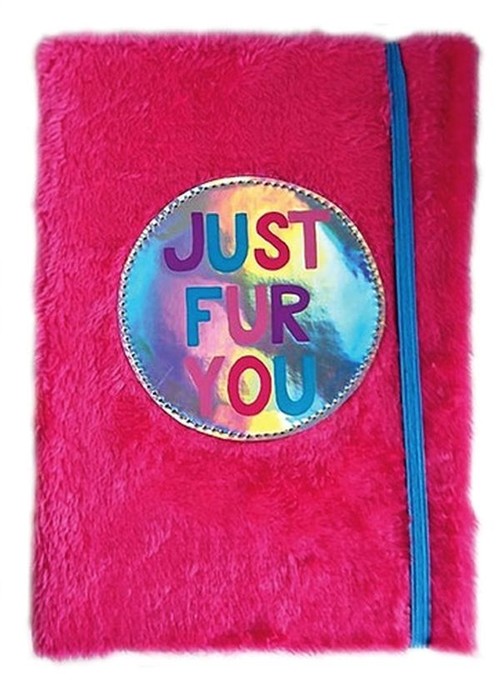 Notatnik ma króciutkie, różowe futerko. Na środku okładki znajduje się mieniący metalicznie okrąg z napisem „JUST FUR YOU”. Wygodna gumka zabezpiecza notatnik przed przypadkowym otwarciem.
