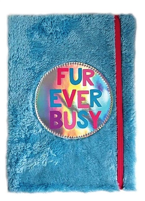 Notatnik ma króciutkie, błękitne futerko. Na środku okładki znajduje się mieniący metalicznie okrąg z napisem „FUR EVER BUSY”. Wygodna gumka zabezpiecza notatnik przed przypadkowym otwarciem.