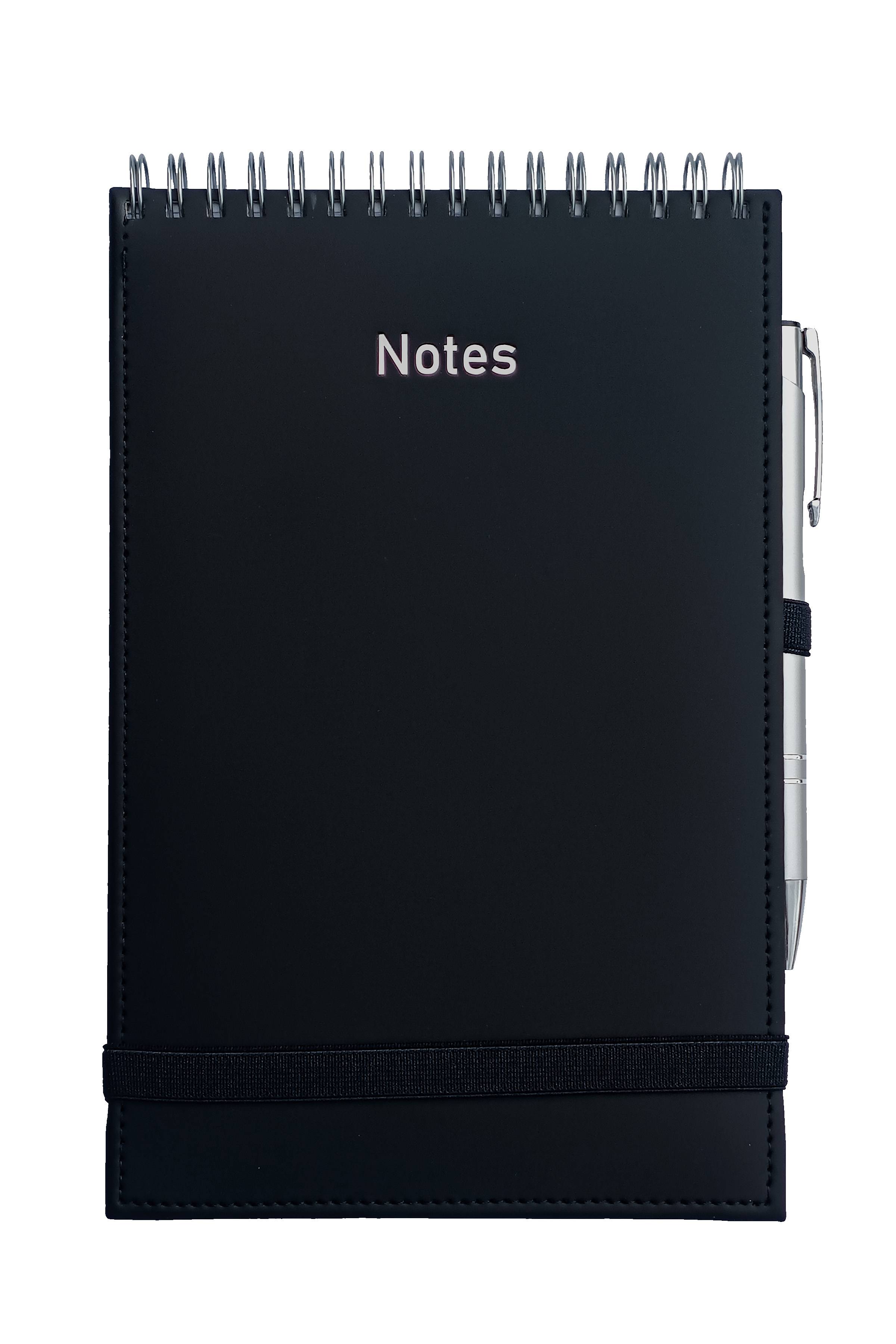 Notes A5 w oprawie Vivella ze spiralą po krótszym boku, gumka zamykająca i gumka na długopis w kolorze okładki, papier biały 70g/m2 w linię, ilość stron 160, napis "notes" SigmaChrom.