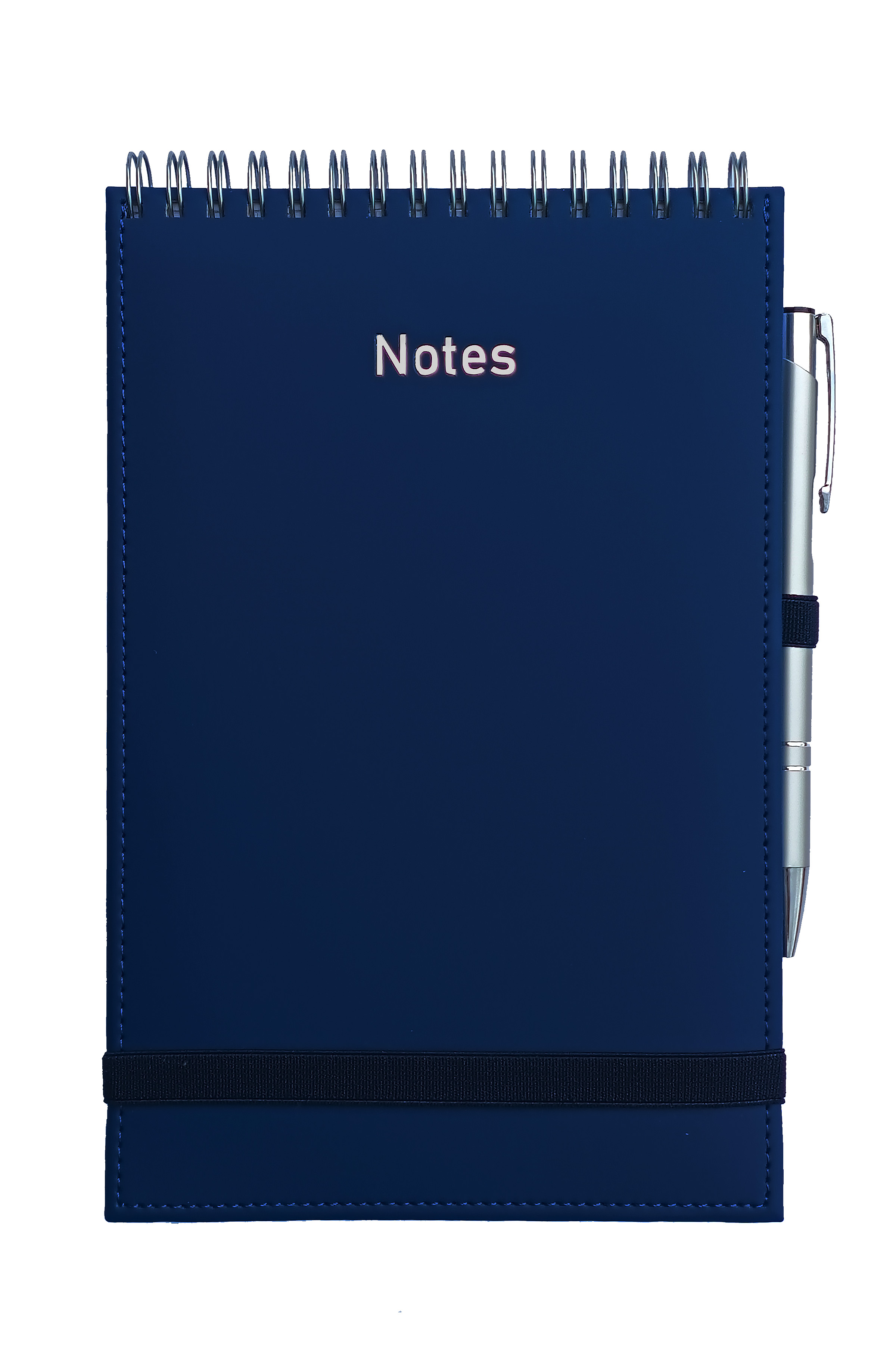 Notes A5 w oprawie Vivella ze spiralą po krótszym boku, gumka zamykająca i gumka na długopis w kolorze okładki, papier biały 70g/m2 w linię, ilość stron 160, napis "notes" SigmaChrom.